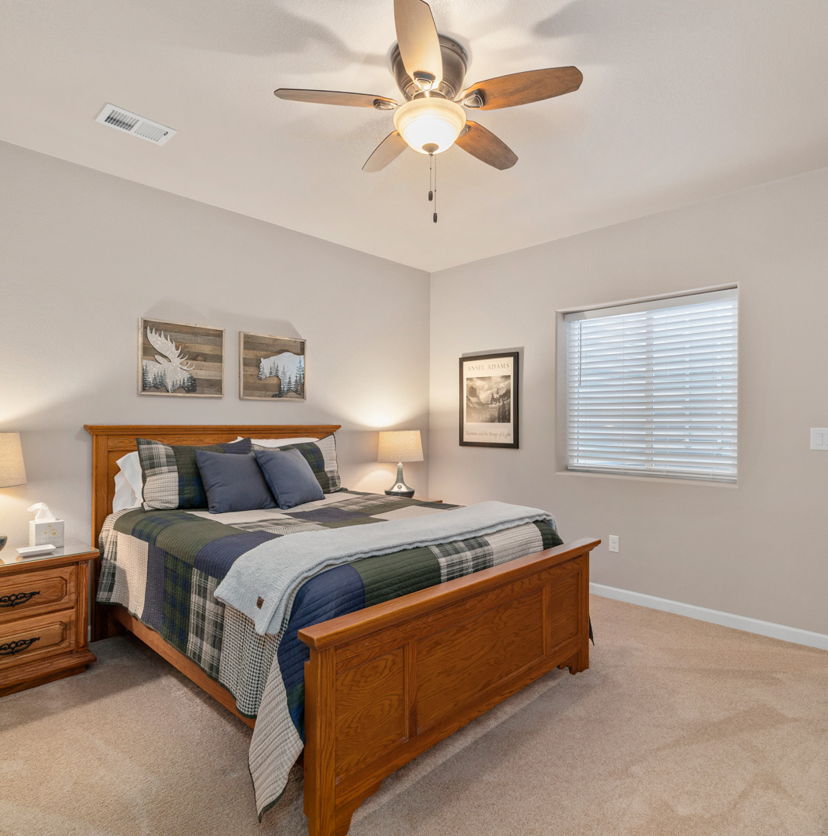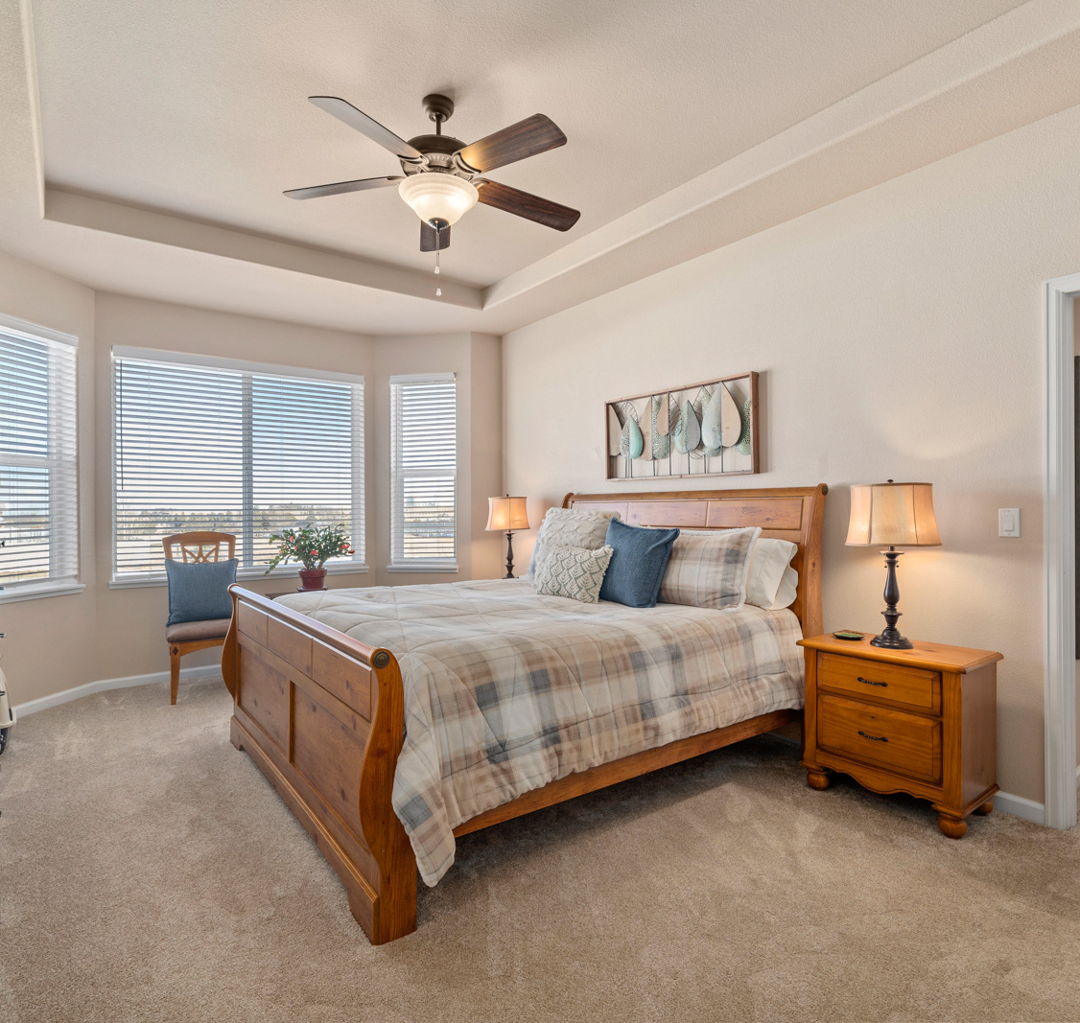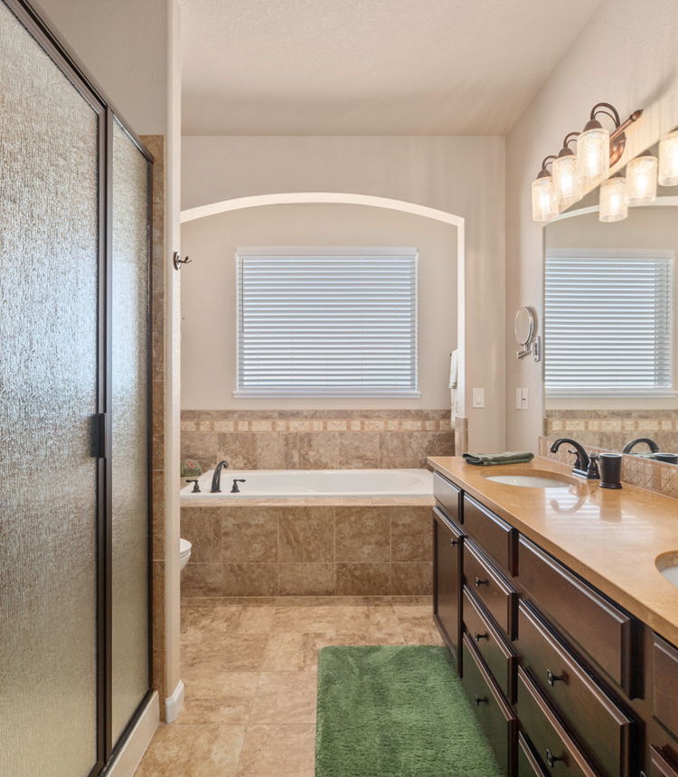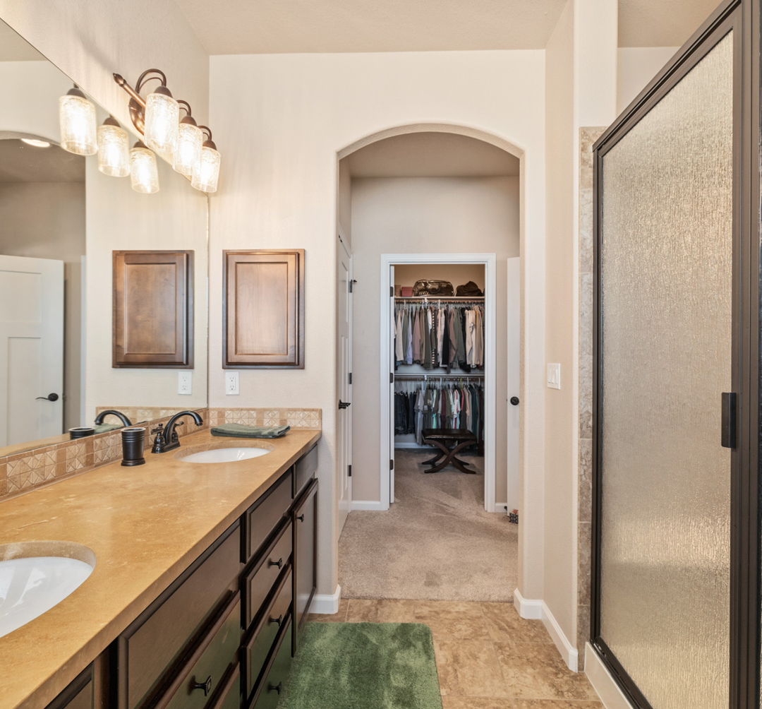 The en-suite primary bathroom offers a luxurious retreat with dual vanities, a relaxing bath, and a spacious walk-in shower, providing both comfort and functionality.